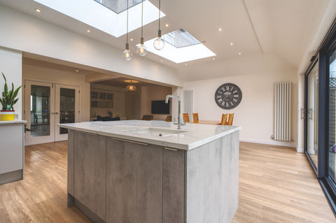 With large skylights and floor-to-ceiling glass doors running the width of the open plan kitchen and lounge, this extension is flooded with natural light. It features a central island for easy dining, food preparation and entertainment. This ground floor extension has transformed a small and dark space into the heart of this family's home.
