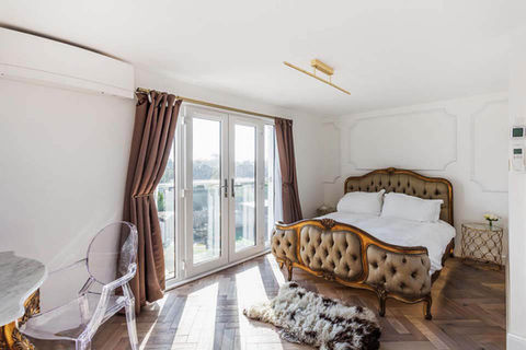 With eye-catching parquet flooring, this loft conversion was all about creating a sophisticated top floor bedroom. Double glass doors open to reveal a Juliet Balcony and view over a long garden, while flooding the interior with natural light. Wall panelling together with brass finishes offer this Making Rooms project a clean and almost regal look.